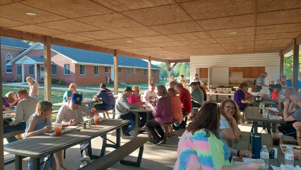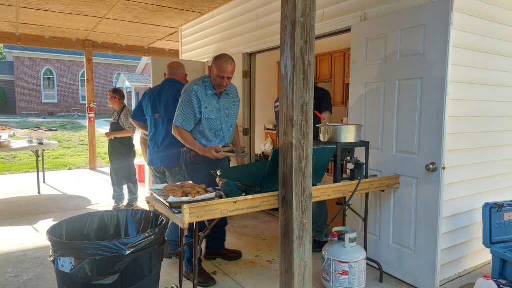 The men treated us to a fried fish and all the trimmings dinner. The menu had fried fish, chicken tenders, slaw, fries and hush puppies. The weather was great and we were able to eat under the Pavilion. Thank you so much to the guys for treating us to wonderful food and fellowship.